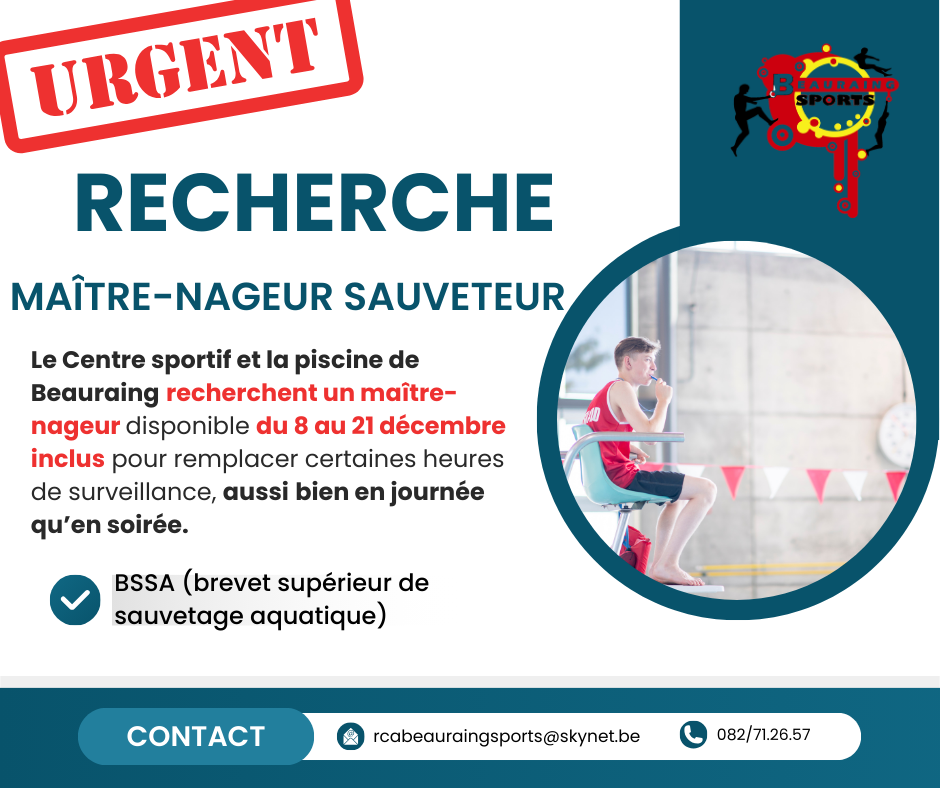 URGENT ! Le Centre sportif et la Piscine de Beauraing recherche un Maître-nageur Sauveteur (remplacement) par AES-AISF | Déc 8, 2025 | Offre d'emploi | 0 commentaires